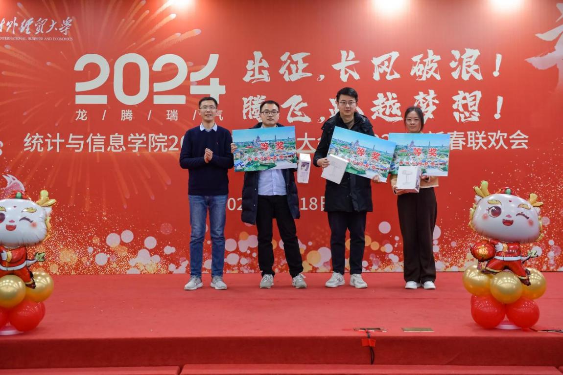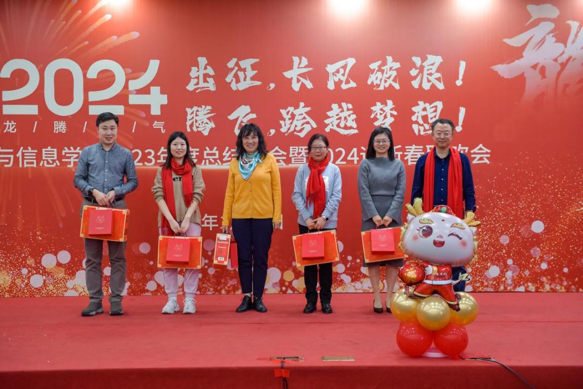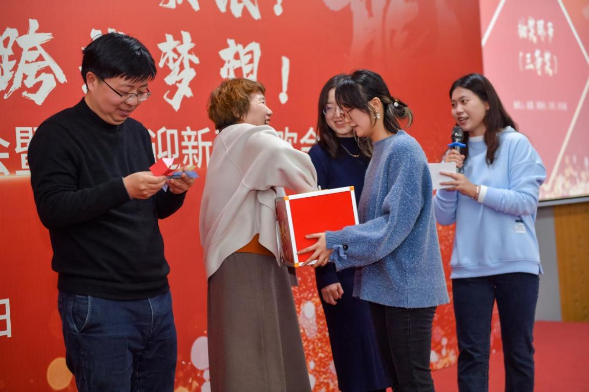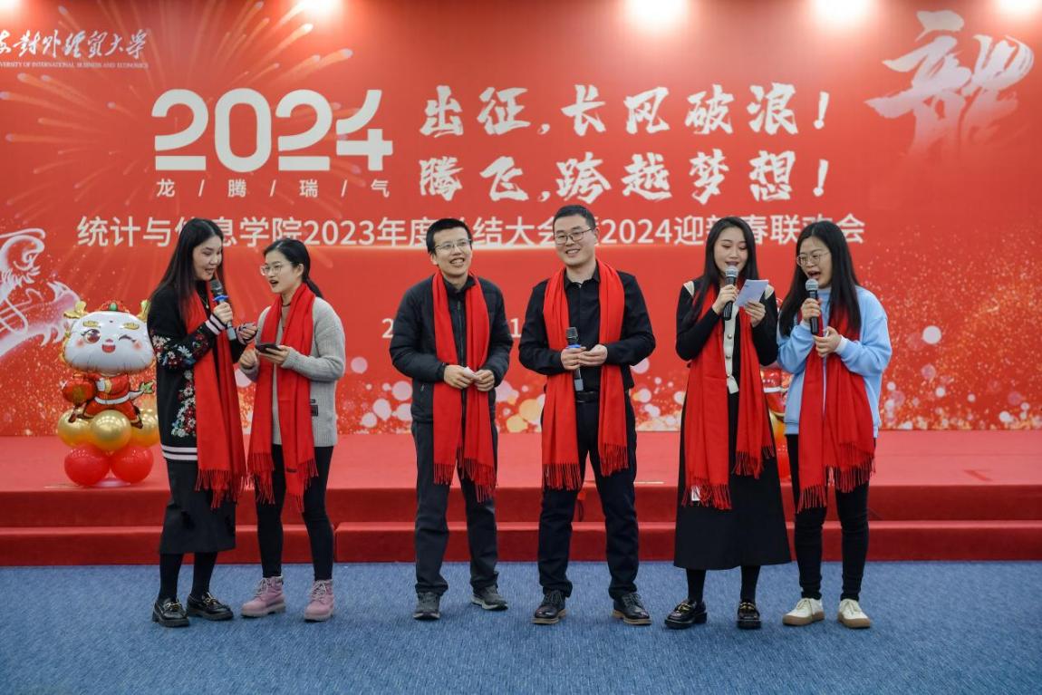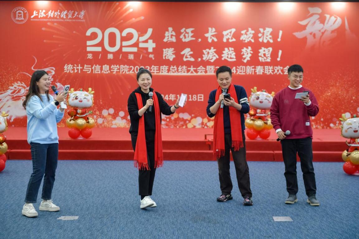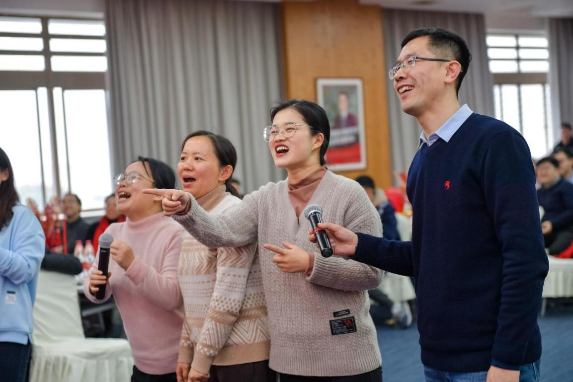 总结会后,学院举行迎新春联欢会。联欢会由2023年新进教师代表秦杏、孙强、刘轩旖和彭鹏主持。