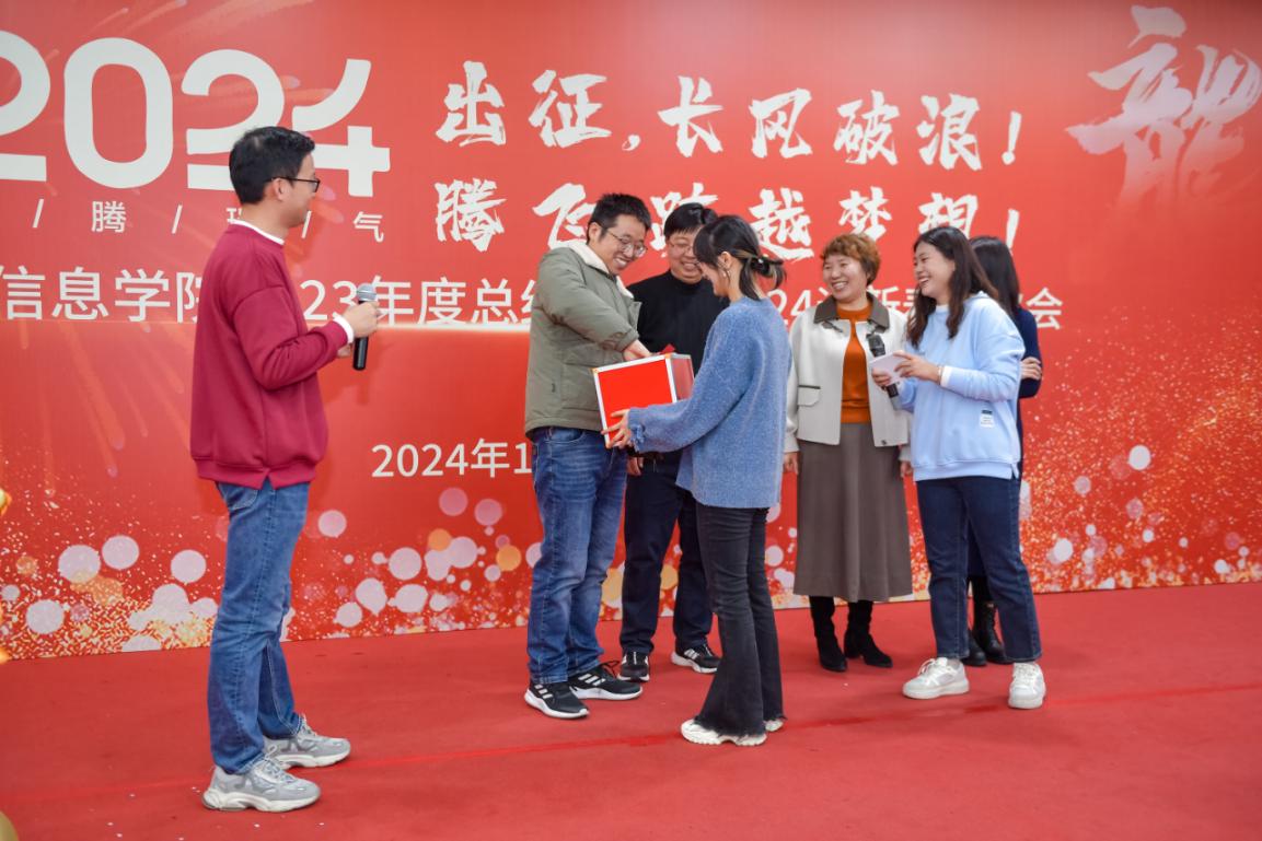 1月18日下午,统计与信息学院以“出征,长风破浪!腾飞,跨越梦想!”为主题,在信息楼526会议室举行2023年度总结大会暨2024迎新春联欢会,学院全体教职工欢聚一堂,回顾2023,展望2024,喜迎新春,共话发展。总结大会由学院党委书记刘素贞主持。