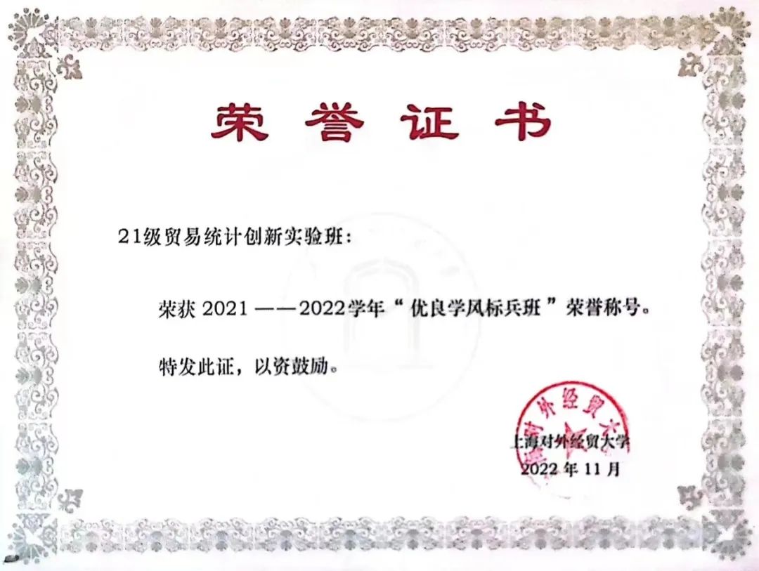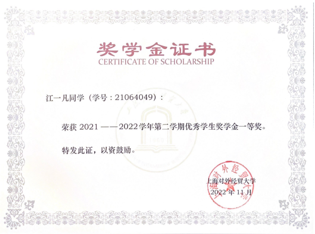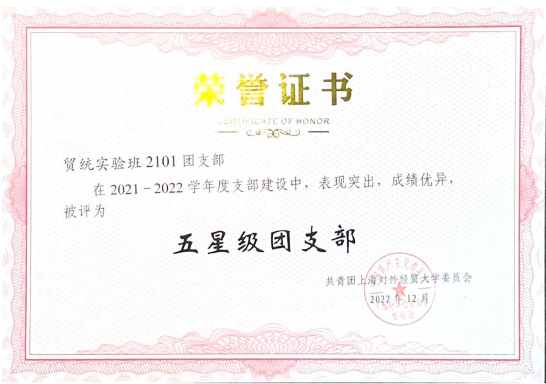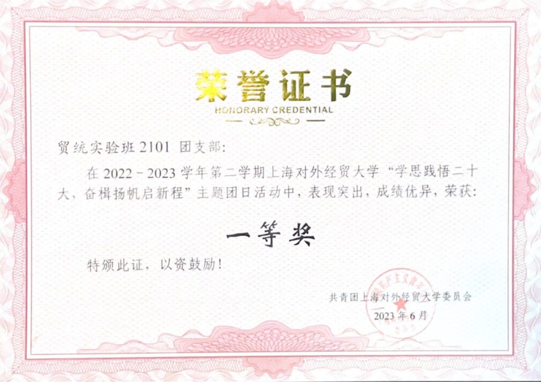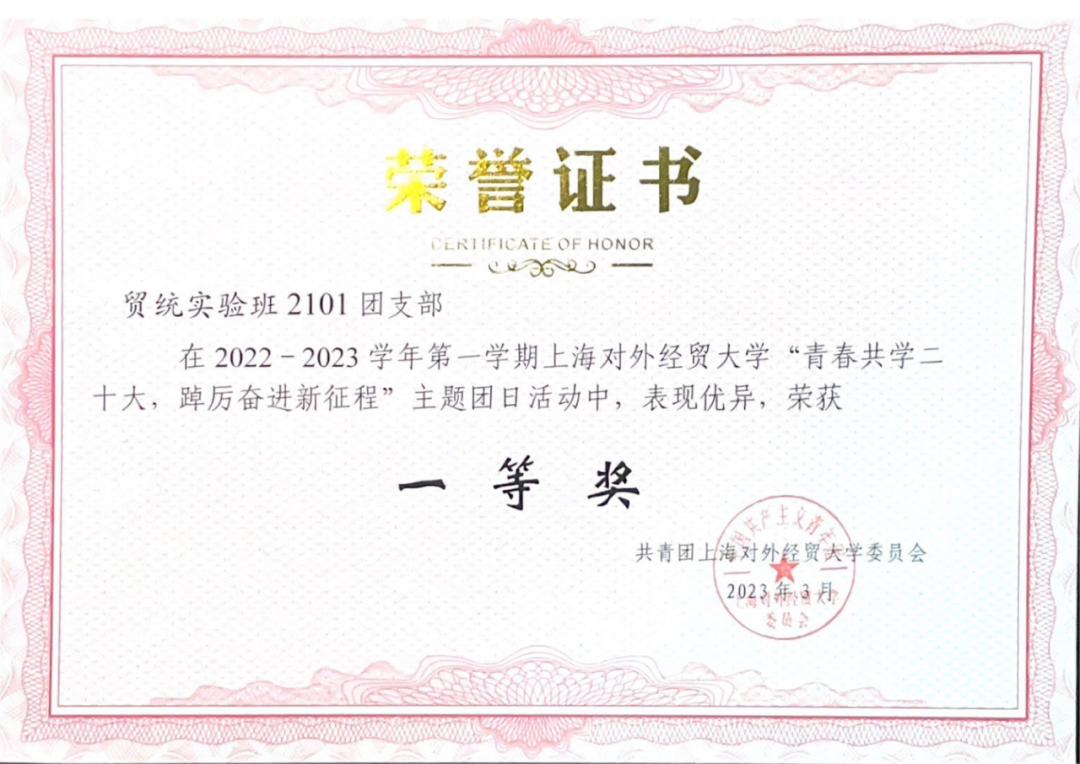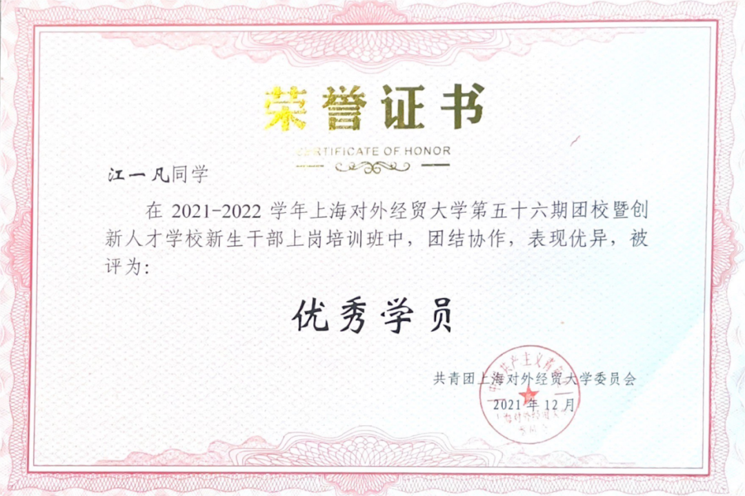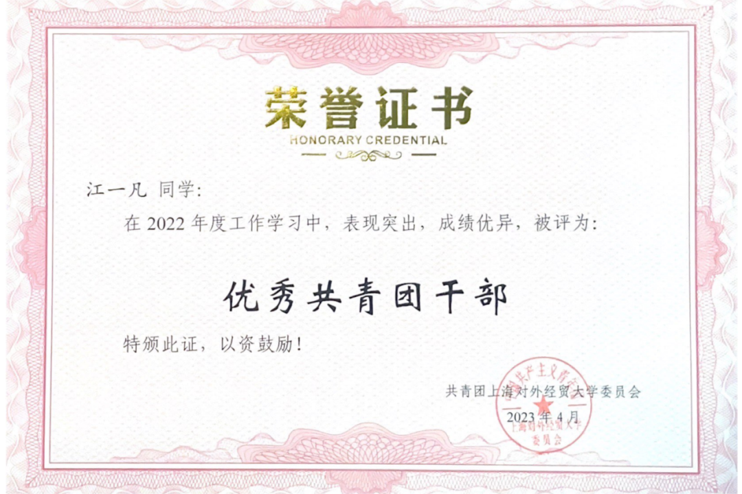 作为团支书,江一凡致力于支部建设。在她的带领下,贸统实验班2101团支部以习近平新时代中国特色社会主义思想为指导,努力建设成政治素质过硬、学风班风优良的集体,先后获评上海市活力团支部、校“五星级团支部”、团日活动评比一等奖和“优良学风标兵班”等荣誉称号。