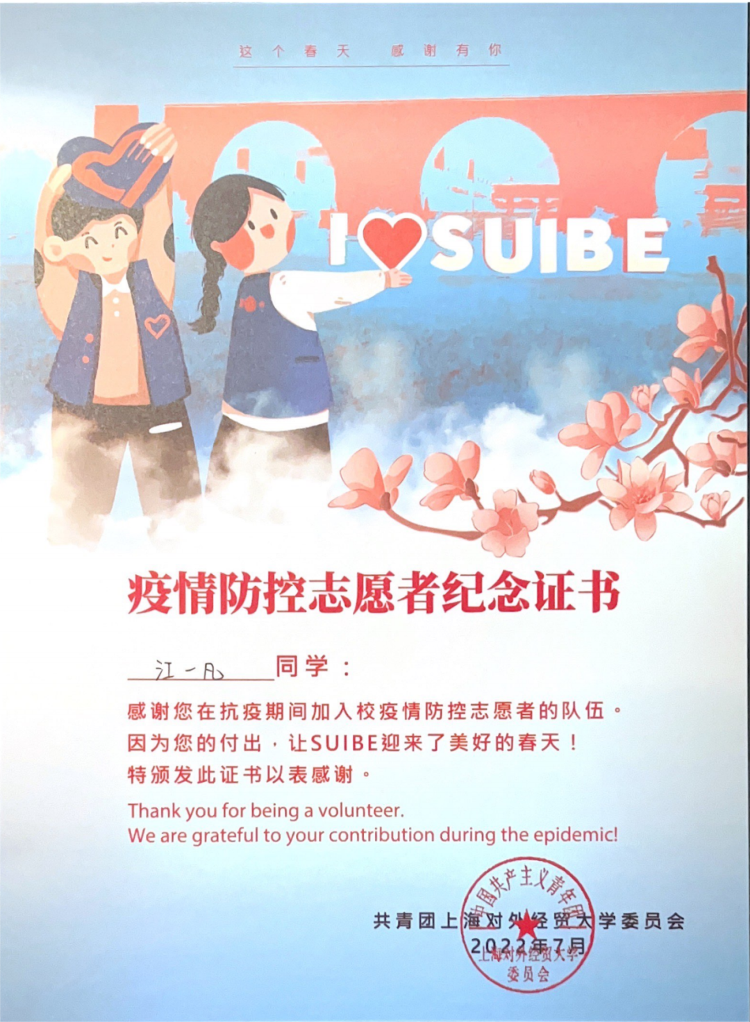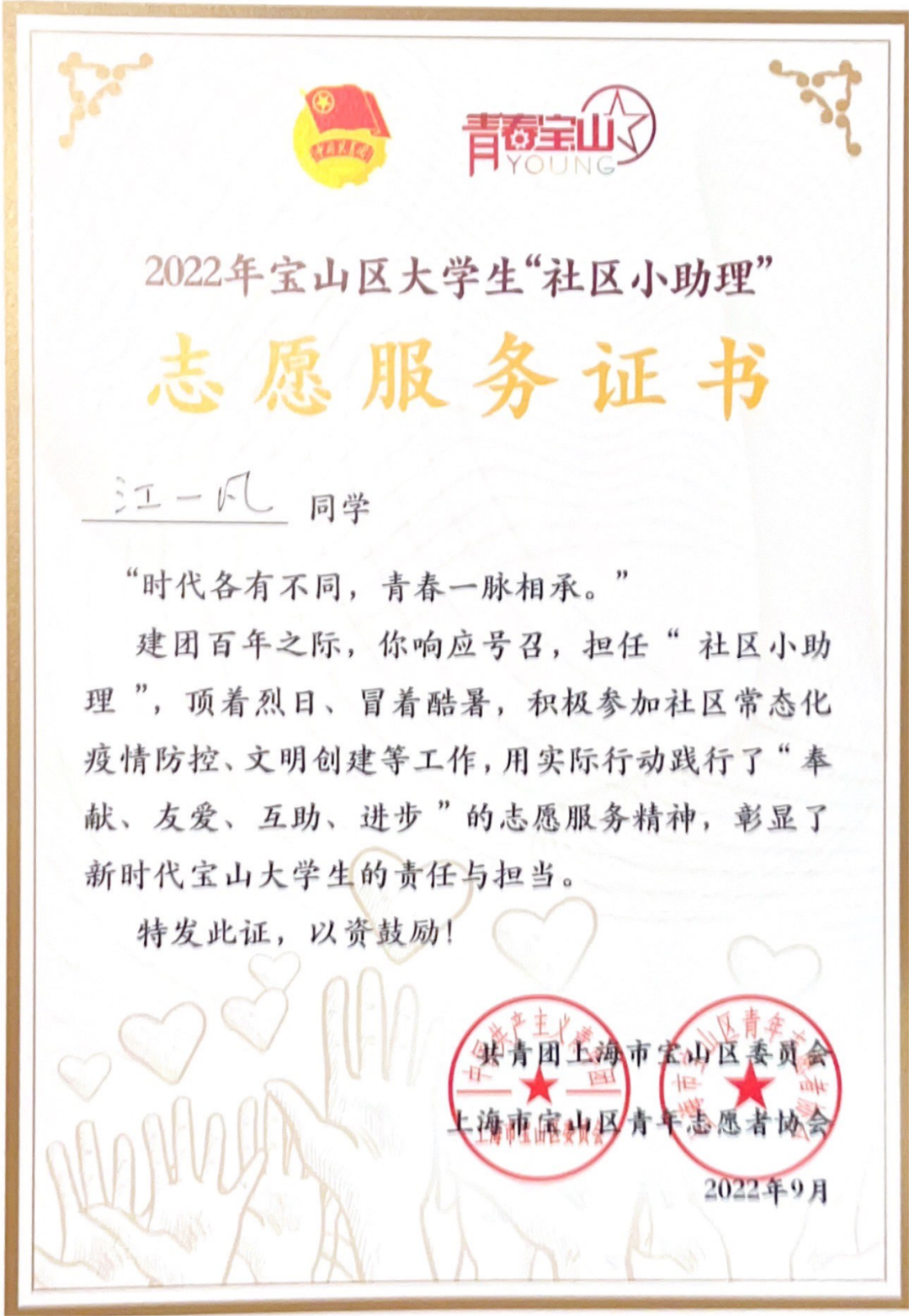 江一凡秉持“奉献、友爱、互助、进步”的精神,积极参加志愿服务。入学以来,她先后参加 “徐家汇源”“青领工程”等多项校级志愿服务。疫情期间,她主动去社区报到,成为核酸采样辅助志愿者,并参与上海市“社区小助手”志愿服务,传递爱心奉献、不求回报的精神。