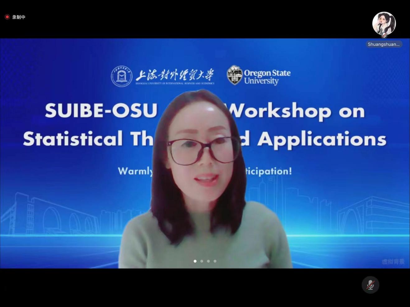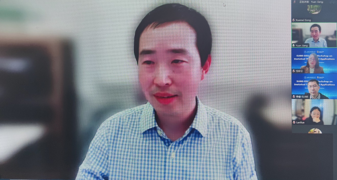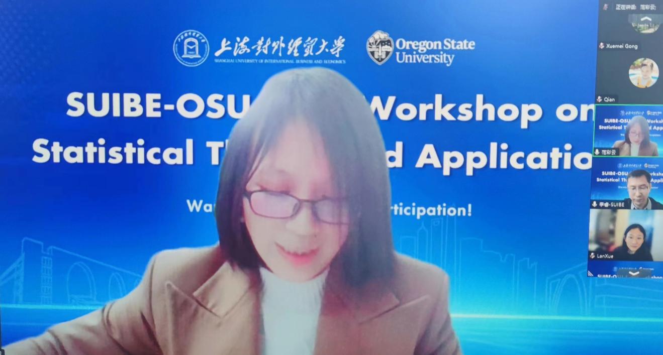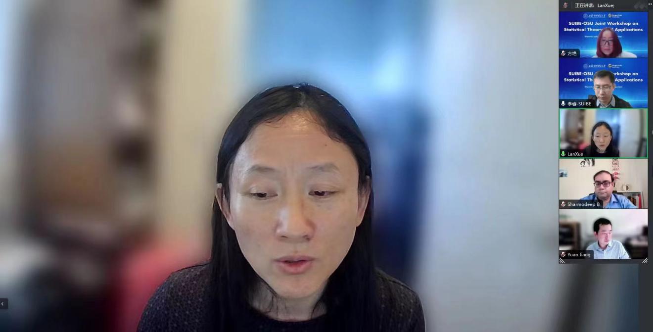 俄勒冈州立大学统计系主任薛兰教授致辞,对我院积极组织这次研讨会表示感谢,并介绍了统计系发展情况,希望在学生项目和教师访问等建立紧密合作。