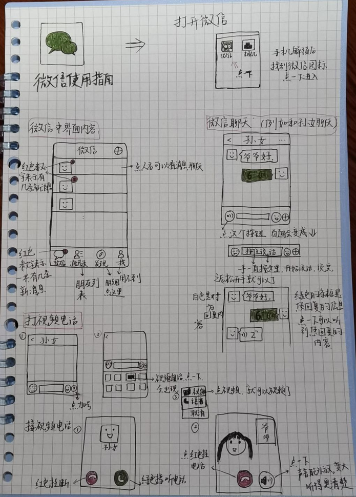郑颖同学在教家中老人使用智能手机时,绘制了一份《微信聊天操作指南》,图文并茂地展现了进行微信聊天的使用步骤,方便老人温故而知新。