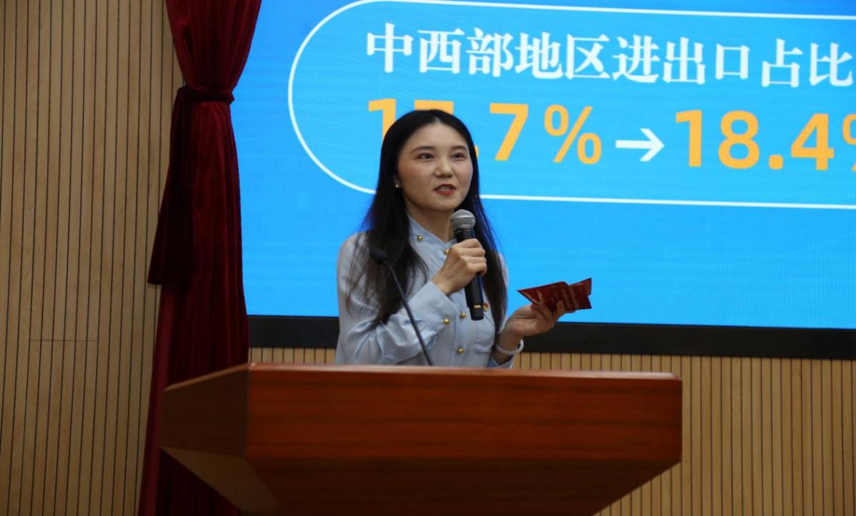 统计与信息学院“数说党史 数说中国”理论宣讲团为师生党员开设了两堂微党课。应用数学系教工党支部书记李瑞囡和应用统计专业本科生党员刘铮宇同学共同讲授“数说贸易强国”微党课,通过大量的数据展示新时代以来国家对外贸易发展的进程,在规模跃升、结构优化、高质量发展方面取得的成绩,并以详实的数据分析解读5年来学校师生在“访万企 读中国”社会调查项目中扎根企业一线接力调研,为服务贸易强国建设做出的贡献。