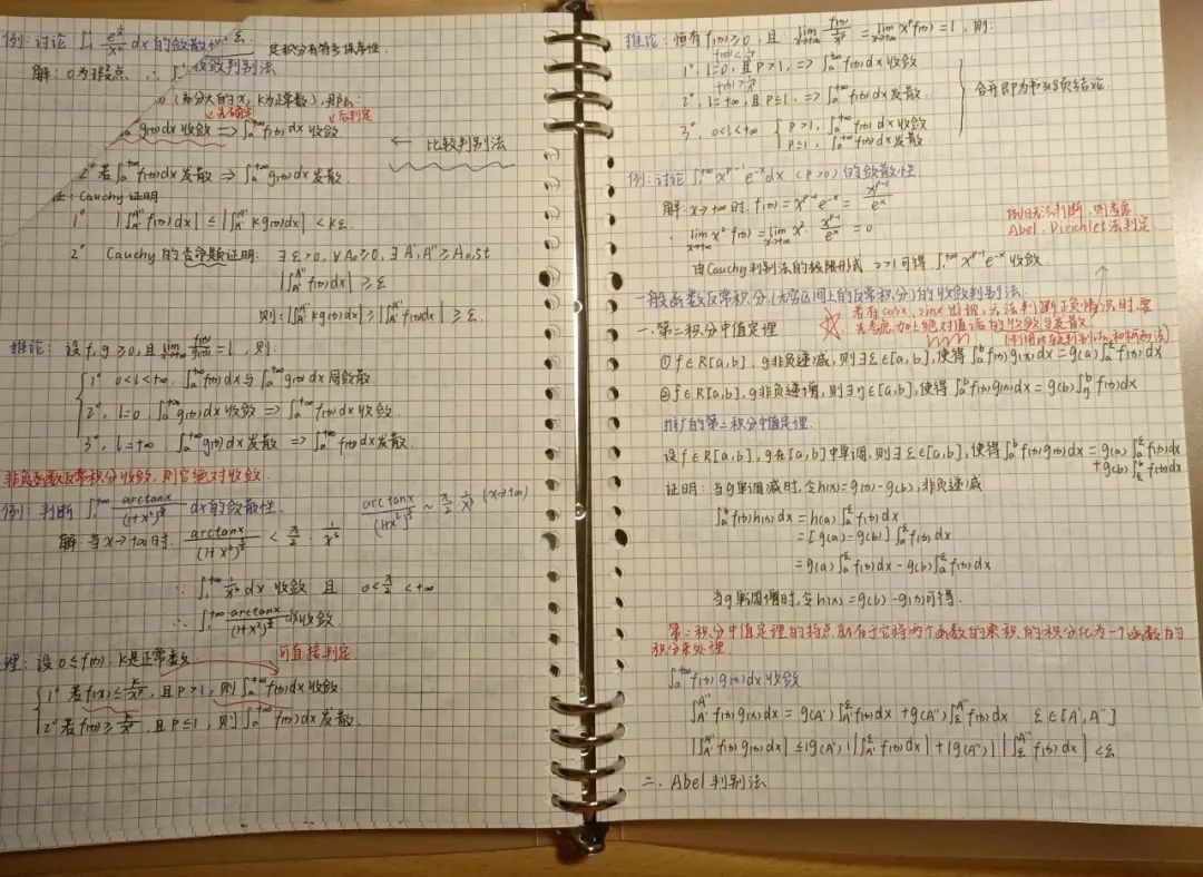 Tips:一般我记笔记的时间为下课之后,写作业之前。我感觉在这个时间内记笔记是最合适的,既不会耽误上课听讲,也不会因为时间过得久了而忘记上课讲的重点,还可以重新梳理知识点,加深对知识点的理解,方便之后写作业。笔记的内容方面,一般我会结合书本和老师上课的ppt,从基础概念,到例题分析,再到个人总结,我都会考虑到,我也会写下自己常犯的错误,提醒自己不要再犯,也会标记重要知识,方便以后复习。除此之外,我在考试之前也会记笔记,我会先看一遍考试范围内的所有知识点和例题,这个过程中的一些感悟以及不熟悉的地方或者我可能犯错的地方,我也会专门记录用于考前的提醒,所以考场外就可以只看一遍注意事项了。