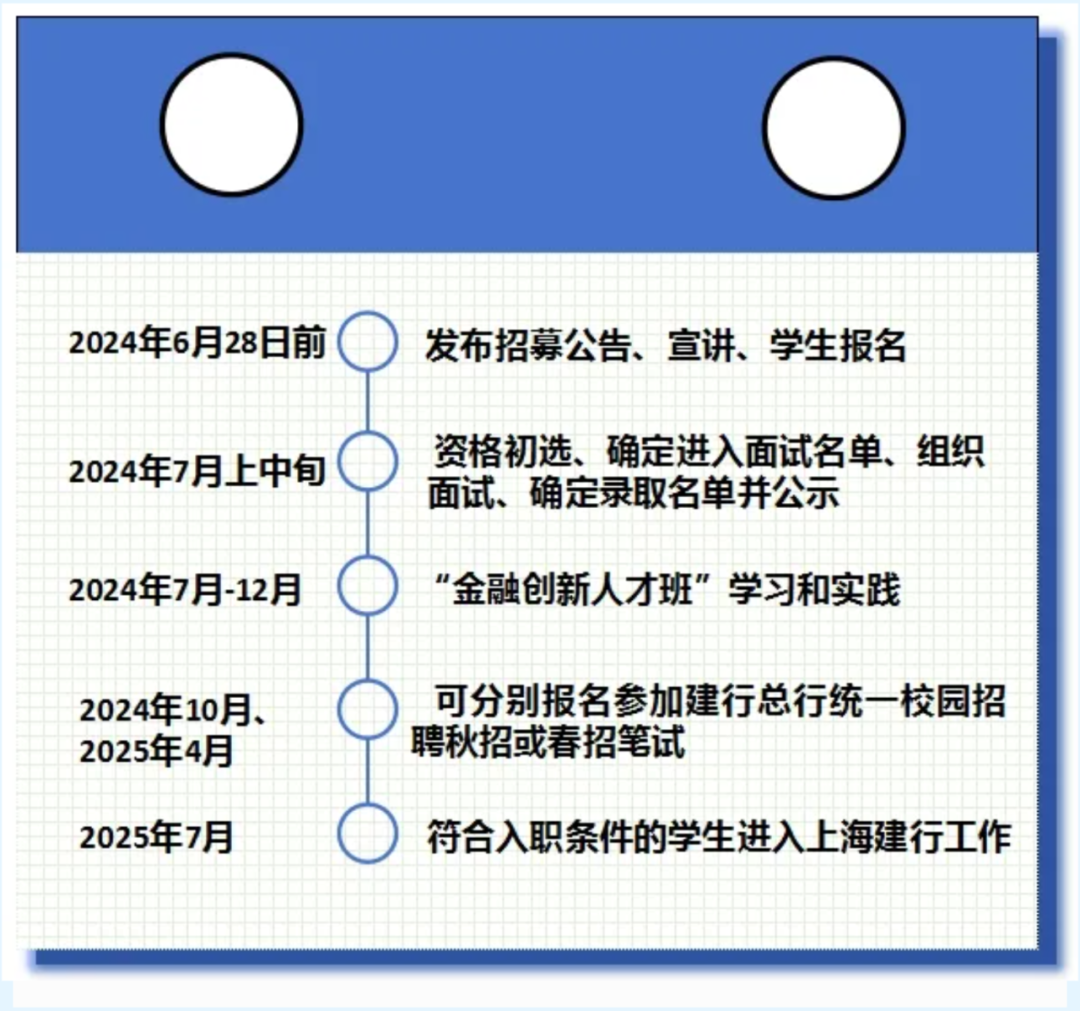 学生进入“金融创新人才班”培养,完成规定的课程学习和实习实践任务考核,报名参加2025年度建行校园招聘(秋招或春招),在建行官方网络渠道成功报名应聘“中国建设银行上海市分行”所辖机构相应岗位的,通过建行总行统一校招笔试考核后,即可获得校招优先录用资格;在符合其他入职条件的情况下,毕业时进入建行上海市分行工作,签署五年劳动合同,后续将根据个人能力及单位需要,安排从事科技金融、数据挖掘分析、信息技术相关或业务营销、客户服务等相关工作。