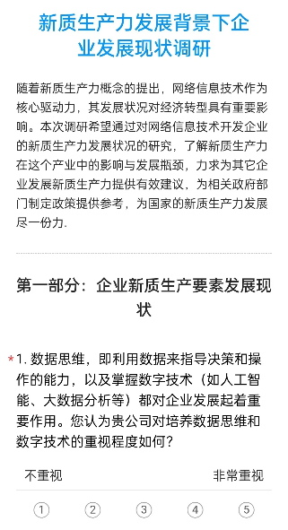 本次调研希望通过对网络信息技术开发企业的新质生产力发展状况的研究,了解新质生产力在这个产业中的影响与发展瓶颈,力求为其它企业发展新质生产力提供有效建议,为相关政府部门制定政策提供参考,为国家的新质生产力发展尽一份力。