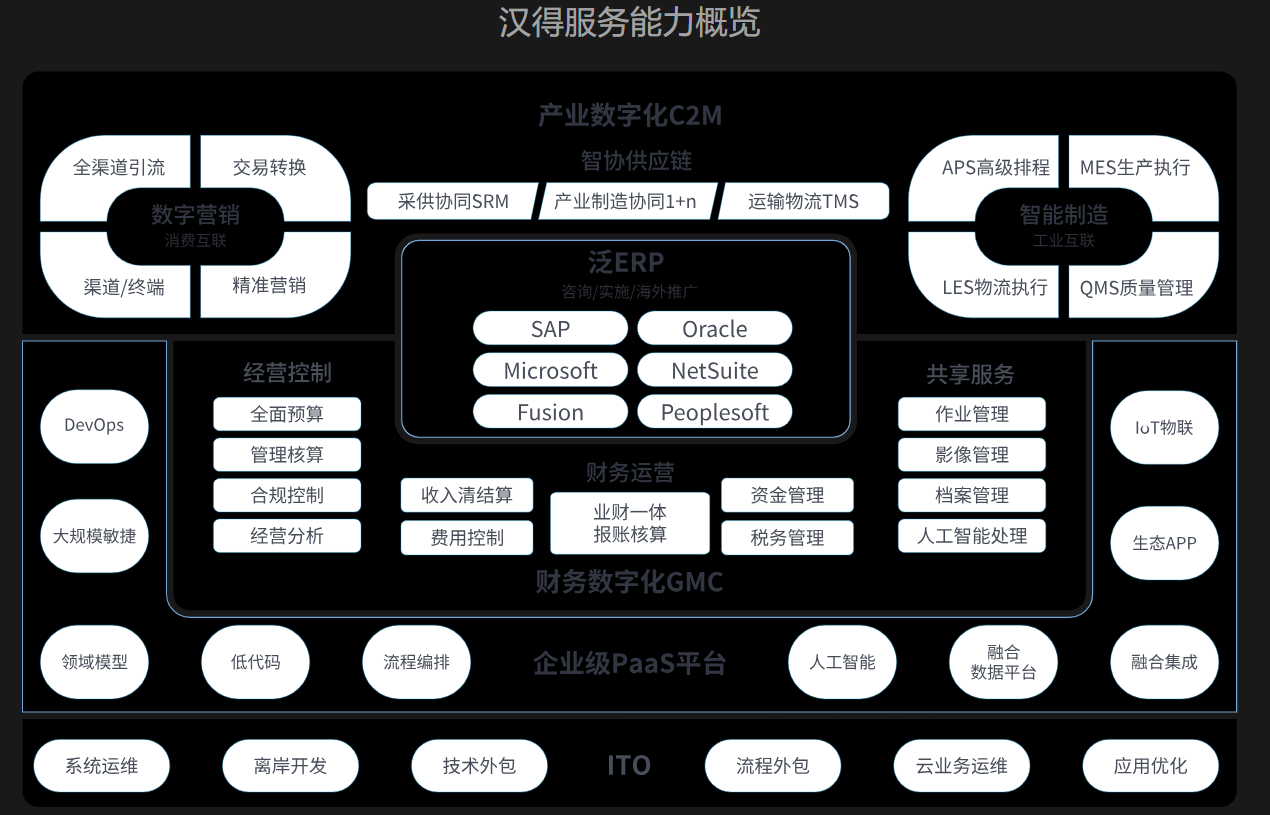 汉得具备全面的企业数字化服务能力,聚焦“产业数字化”、“财务数字化”、“泛ERP”和“ITO”四大核心业务,同时持续打磨自主技术平台+自主应用产品+全面实施服务/运维能力体系,只为持续做好品牌企业可长期信赖的数字化好帮手,陪伴和支持品牌企业做大做强。
