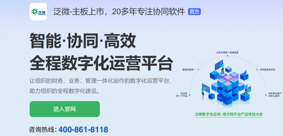 泛微网络科技股份有限公司成立于2001年,总部设立于上海,专注于协同管理软件领域,帮助组织构建统一的数字化运营平台。泛微是“国家规划布局内重点软件企业”,上交所主板上市公司。获得腾讯战略投资、是企业微信战略合作伙伴。