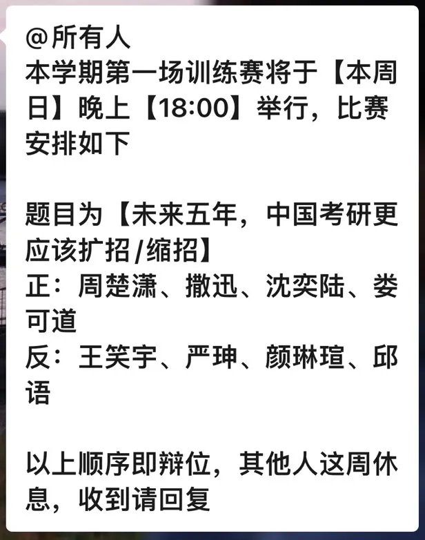 我们每个月都有2~3场的训练赛,每场都有经验丰富,实力强悍的学长姐带队,帮助大家快速熟悉辩论,掌握辩论技巧,更快速的适应赛场,享受赛场,当然,觉得不过瘾可以私戳学长姐,我们会安排更多场次更多题目哦!!!