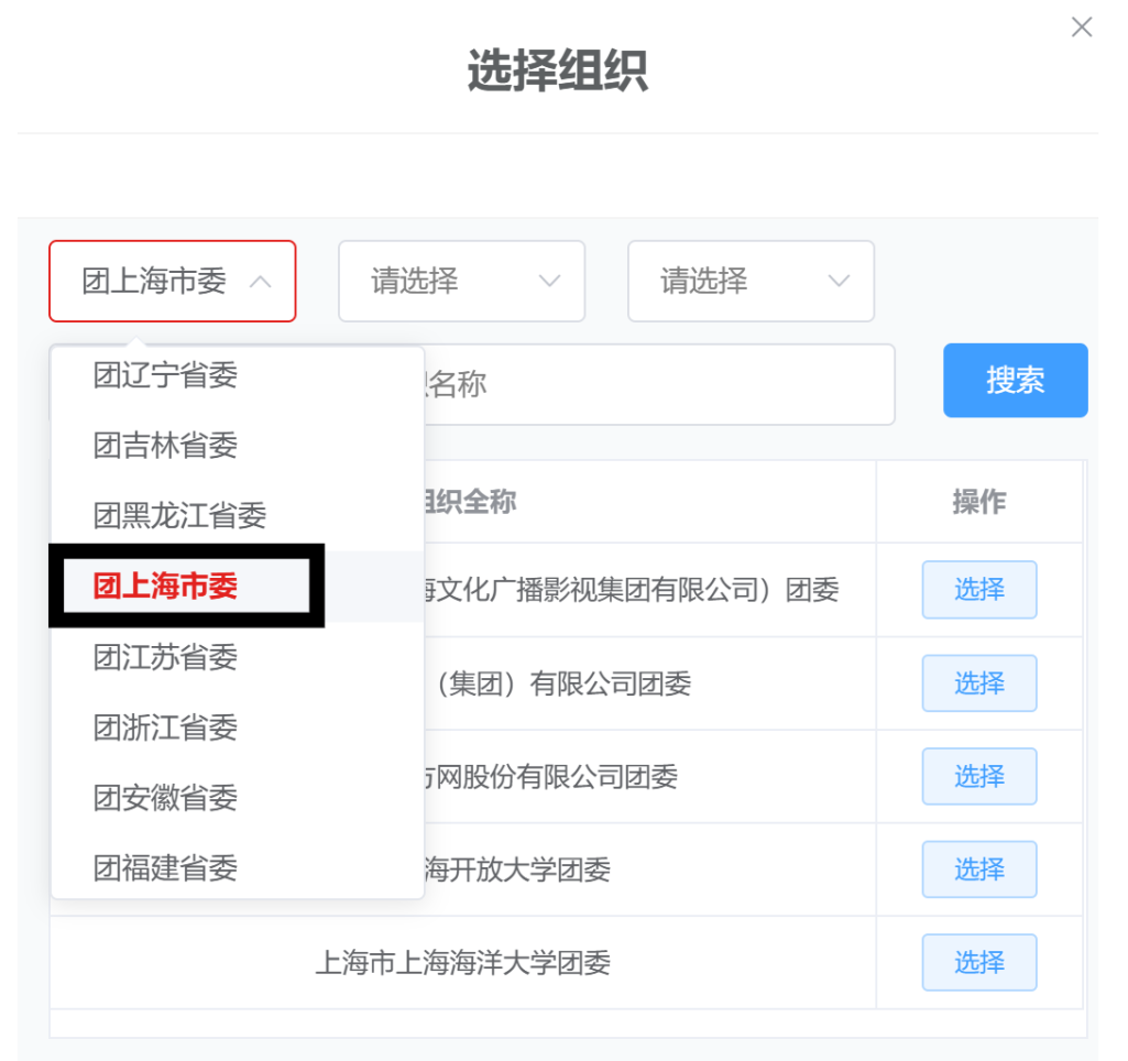在团组织一栏,在三个下拉选择框中,分别选择:【团上海市委】-【必赢626net入口首页团委】-【上海市必赢626net入口首页统计与信息学院XX(专业全称)240X团支部】。如“上海市必赢626net入口首页统计与信息学院经济统计学2401团支部”等。