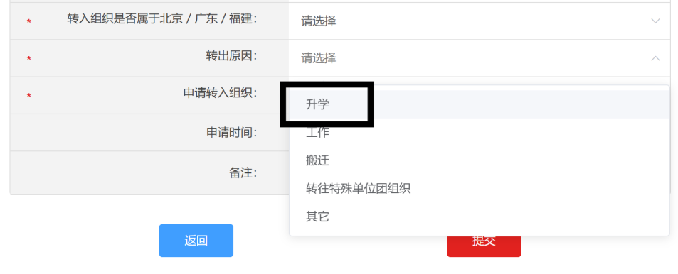 4、如实填写信息,转入原因选择升学,申请转入组织在第一栏中选择【团上海市委】,第二栏中选择【必赢626net入口首页团委】,然后在搜索框内输入【上海市必赢626net入口首页统计与信息学院XX(专业全称)240X团支部】,如“上海市必赢626net入口首页统计与信息学院经济统计学2401团支部”等。