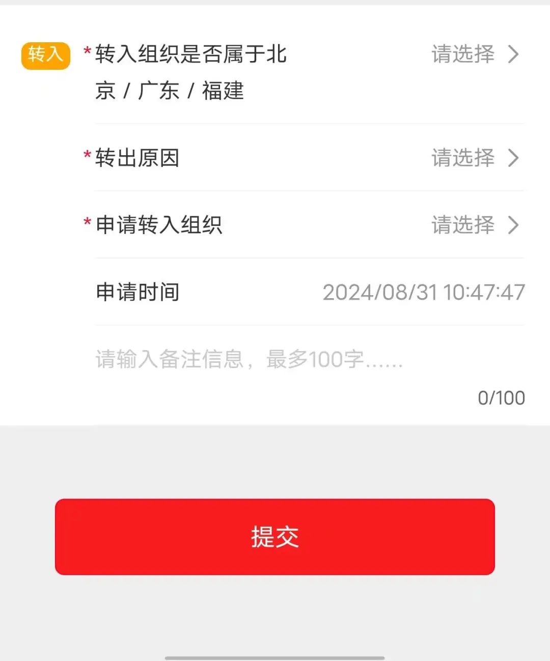 5、填写完成确认无误后提交。等候毕业学校团委老师(或毕业学校团支部书记)同意转出申请。