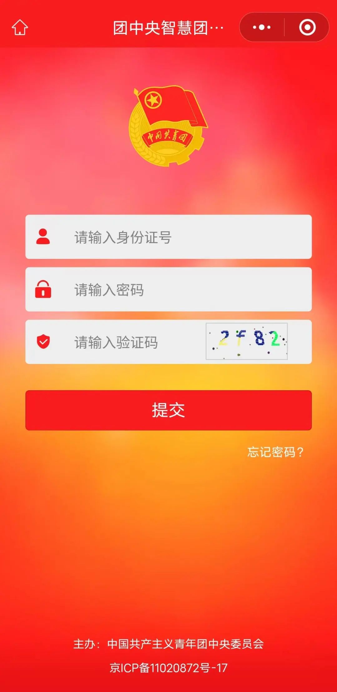 默认密码为身份证后八位,如果遗忘自己修改过的密码,请及时联系毕业学校团委老师或毕业学校团支部的团支部书记获取重置密码验证码。