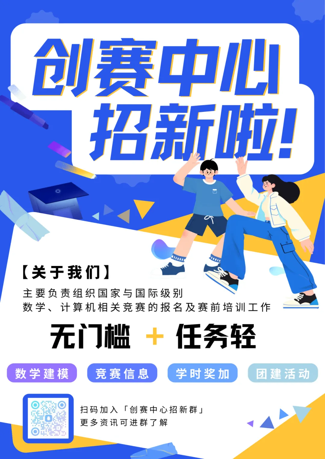 如果你想接触更多数学、数学建模等相关专业知识,或者对竞赛感兴趣,创赛中心是再好不过的选择。我们不仅关注竞赛,更致力于为你提供一个拓展人脉、提升个人能力、丰富大学生活的平台。在这里,你不仅能够获取竞赛的最新动态,还可以通过参与学生会工作结识志同道合的朋友,不论你是否对竞赛感兴趣,都能在这个平台上找到属于自己的成长空间。创赛中心欢迎所有希望拓展视野、积累经验、结交新朋友的同学加入!