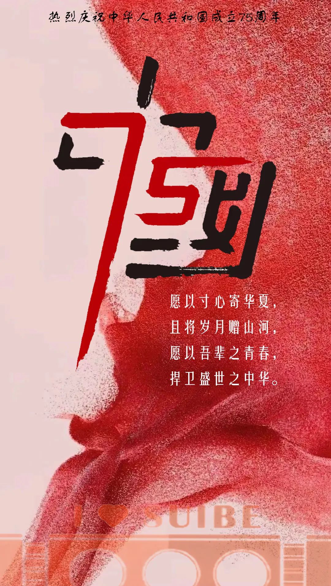 这是一张庆祝中华人民共和国成立75周年的海报。在红色背景上,用黑色和红褐色的字体写着“中国”,而在“中国”中又蕴含了“75”,表现出你中有我,我中有你的思想。下方有两行文字,“热烈庆祝中华人民共和国成立75周年”以及“愿以寸心寄华夏,且将岁月赠山河;愿吾辈之青春,捍卫盛世之中华”这句来自人民日报的慷慨话语。这些字句传达了对国家繁荣昌盛的美好祝愿,并强调个人愿意为祖国的发展与安全贡献自己的青春力量。