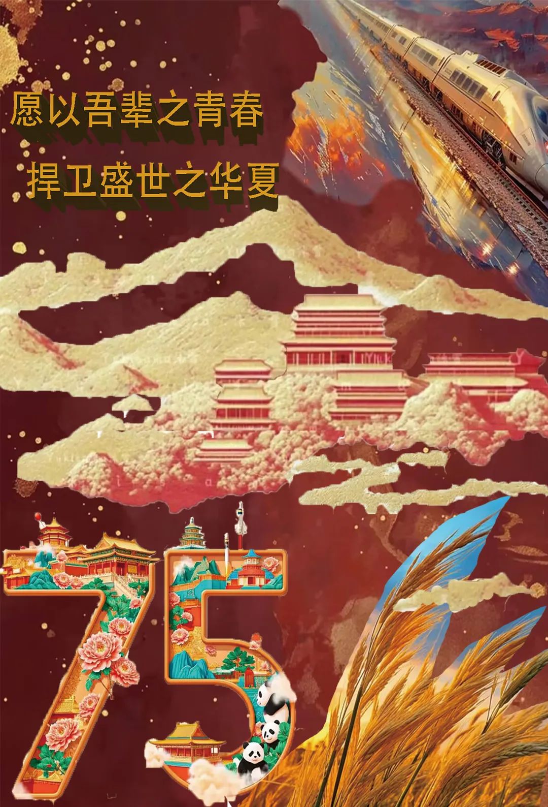 整张海报以中火红为底色,右上角飞驰的高铁代表着科技进步,右下角为饱满的麦穗,代表着新质生产力的突破及人民对美好生活的向往,中间为山云及穿插在山云间的楼宇,体现着中式浪漫。文字部分由两部分组成,左下角是被中国元素填充着的“75”,左上角写着”愿以吾辈之青春,捍卫盛世之华夏“,表达着我们对祖国母亲生日的祝福及吾辈青年愿为祖国献出青春的决心和意志。希望祖国越来越昌盛,人民越来越幸福。中华人民共和国万岁!
