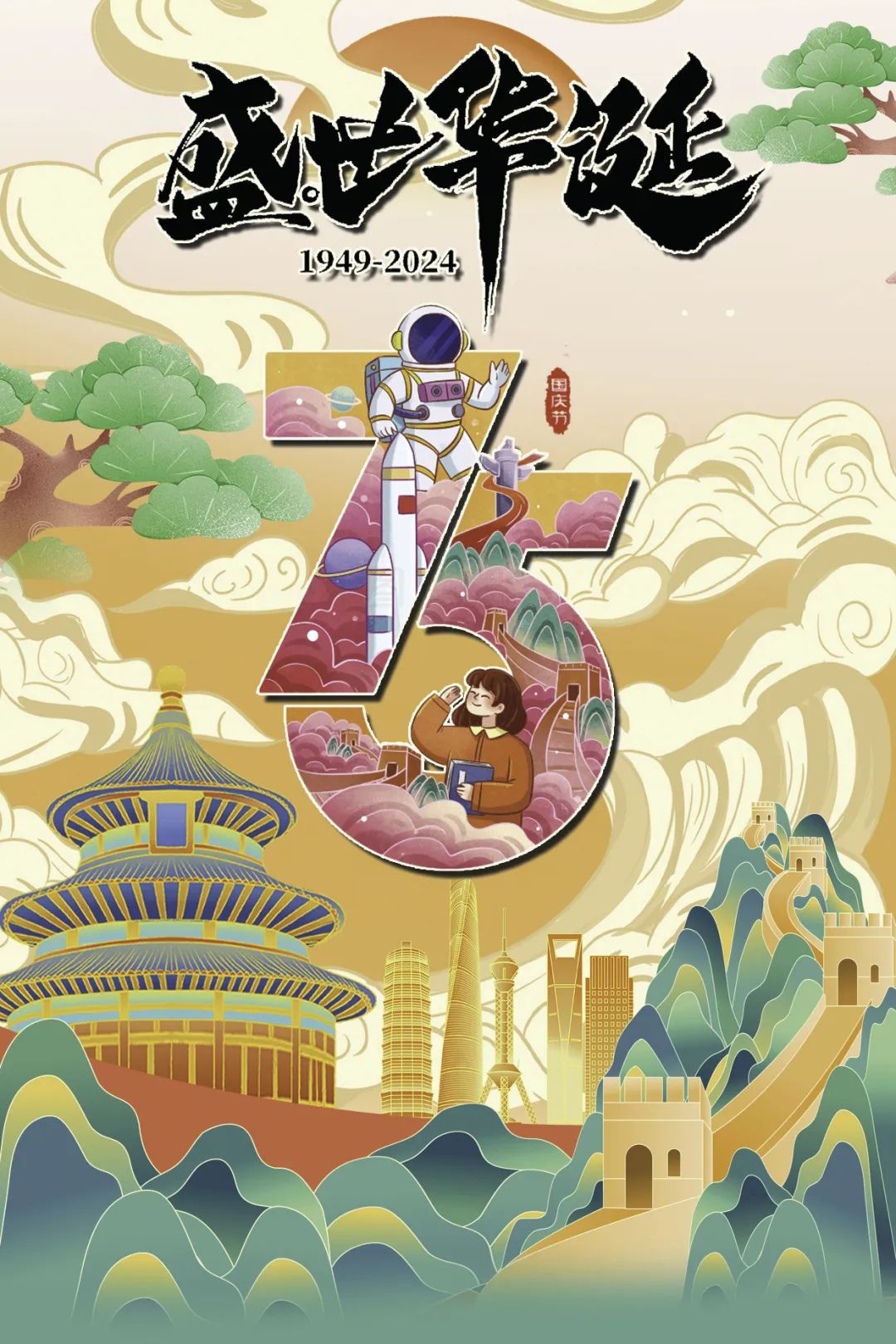 作为作者 ,这幅海报以“喜迎国庆” 为主题,数字“75”突出国庆的重要节点。“盛世华诞”彰显 国家的繁荣昌盛 ,简洁的设计却有着强烈的视觉冲击力。色彩搭配和谐 ,营造出喜庆氛围。 海报旨在表达对祖国的热爱与祝福,在国庆之际,唤起人们的爱国情怀,共同为祖国的辉煌成就而自豪, 为祖国的美好未来而努力奋斗。