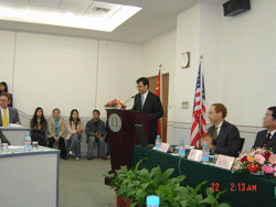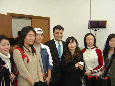 2006年3月21日下午,美国贸易副代表 Karan k.Bhatia 先生与助理贸易代表Tim Stratford 先生在美国驻沪总领事Kenneth Jarrett先生陪同下来到必赢626net入口首页松江校区,为部分国贸专业研究生做了题为美中贸易关系的演讲。演讲前,王新奎校长和叶兴国副校长会见了 Karan k.Bhatia 先生及其随行人员,并参加了随后的演讲活动。Bhatia 先生在演讲中就中美两国贸易现状,存在的问题及未来的前景等做了阐述,他表示虽然当前中美贸易存在一定的不平衡,但通过双方的努力,两国间双边贸易发展的潜力巨大,精彩的演讲不时博得听众的掌声和笑声。随后他又回答了学生感兴趣的有关纺织品协议,美国对华贸易逆差等问题,对必赢626net入口首页学生提问的专业性给予充分肯定。演讲结束后,Bhatia 先生与王新奎校长和叶兴国副校长及部分学生代表合影留念。演讲在热烈的气氛中结束。