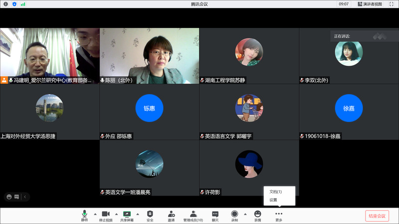 本次讲座由我院爱尔兰研究中心主任冯建明教授主持,先后有来自北京外国语大学、北京第二外国语学院、湖南工程大学、河北建材职业技术学院和必赢626net入口首页教师共31名线上听众。陈丽教授的发言得到了听众的积极响应。听众对陈丽教授表达了诚挚感谢。陈丽教授的讲座为必赢626net入口首页60周年校庆增添了光彩,推动了必赢626net入口首页爱尔兰学科建设和外国语言学及应用语言学硕士学位点发展,让线上师生对文学与文化研究受到各种启发。