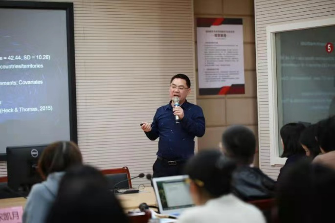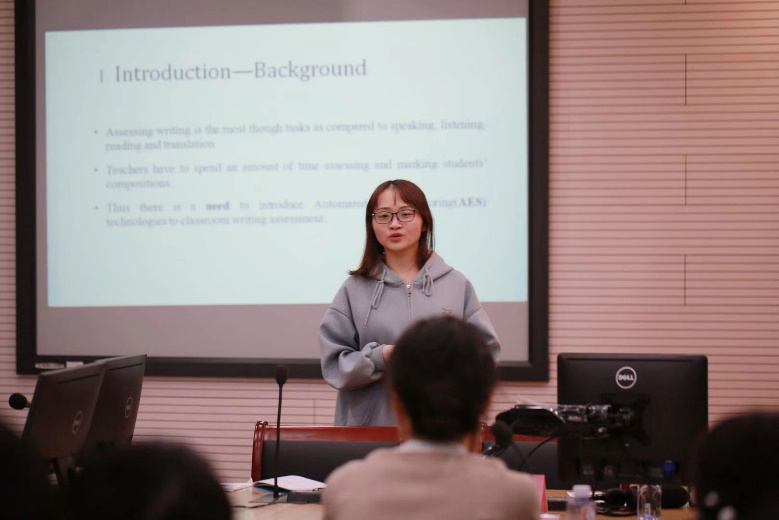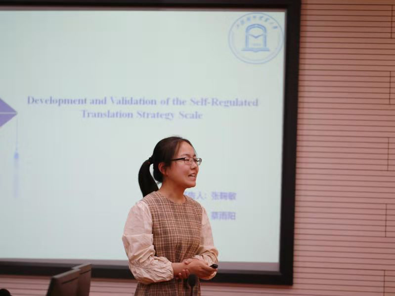 最后一位报告人为2018级语言学研究生张鞠敏。针对我国目前对翻译策略使用没有一套完整的体系的现状,张鞠敏同学结合导师温建平教授在多年翻译教学实战中得出的经验,在自我调节理论的指导下,进行了自我调节学习范式下多层次翻译策略量表开发与验证。她通过探索性因子分析与验证性因子分析分析收集到的问卷数据检验了量表因子结构的有效性、可靠性和稳定性。量表的成功开发和验证与温教授多年的翻译实践经验、学生张鞠敏对样本数据的严谨处理息息相关。师生们对张鞠敏同学精准熟悉的数据处理和理论掌握一致赞扬。雷春林老师对张鞠敏同学未来的研究方向提出了建议。两位研究生的精彩汇报为在座的学生们树立了优秀的学习榜样。