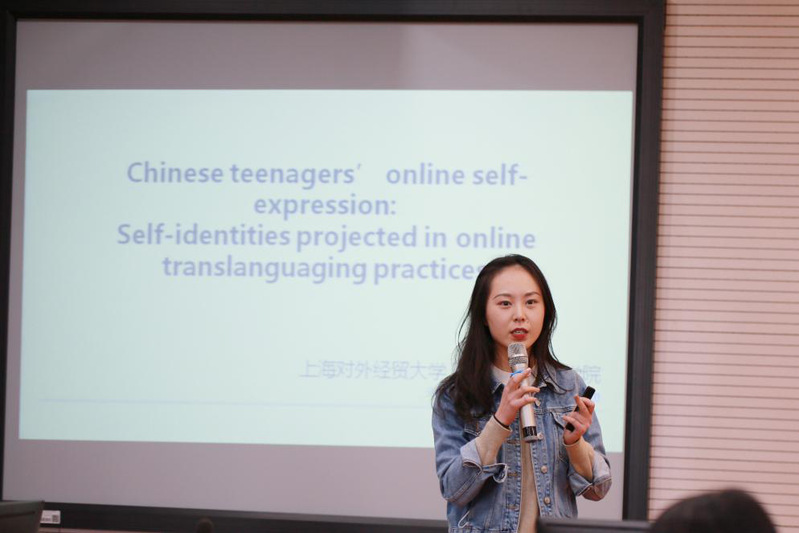 第三场报告我院青年教师张罗铭博士分为师生们介绍了中国青少年在网络超语(translanguage)行为中的自我认同。张罗铭博士利用微信平台,跟踪收集了高中生朋友圈的语言图片及其他形式的表达。通过数据分析,张博士发现,相比在现实生活中比较羞于使用英语表达,中国青少年在网络环境中有更高的表达欲望和更好语言创造性,中国青少年在网络环境下有更高的自我身份认同。此外,研究对二语教学也带来启发:可以将信息技术应用于二语学习和教学当中,促进学生学习语言的热情,这与吴朋教授和蔡雨阳教授的研究也十分契合。