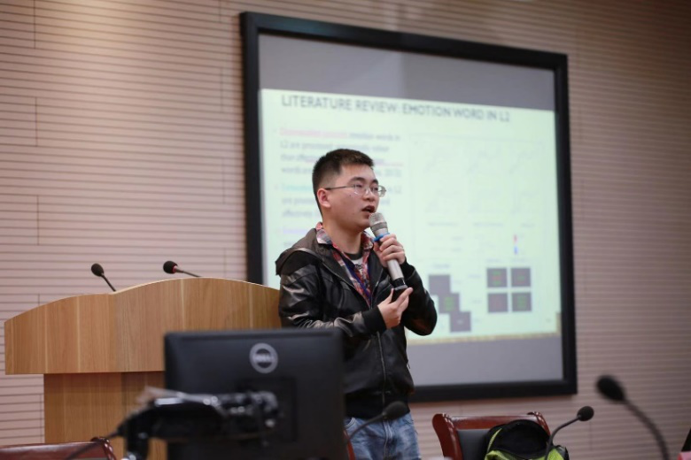 第一场报告中,来自上海外国语大学国际教育学院,澳门大学教育学博士吴成刚老师同师生们分享了自己的实证研究:通过使用ERP(事件相关电位技术)和掩蔽启动范式方法,观察情绪负载词(例如break up, birthday)和情绪标签词(例如sad, happy)对23名中英双语使用者情绪感知的刺激情况,研究结果为,情绪标签词,尤其是负面情绪词更容易影响实验者的情绪刺激更快影响更大。吴博士指出,语言和情绪感知的联系有益于二语教学实践,可以通过控制不同类型的情绪词的输入,来优化二语词汇学习效率。吴博士的研究结合了神经学与语言学,引起了师生们浓厚的好奇与研究兴趣。