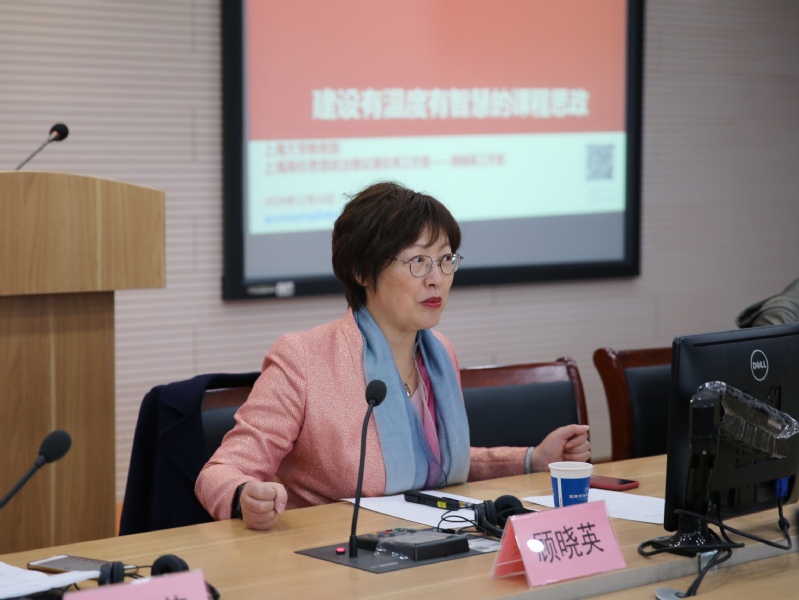 在专家报告环节,顾晓英教授结合教育部《高等学校课程思政建设指导纲要》和课程思政建设质量自查指标体系,首先介绍了上海大学近年来思政课教学改革取得的成绩,其次重点介绍了她所领衔的、与思想政治理论课“同向同行”的通识选修课——从“大国方略”到“时代音画”等系列课程创新思路及做法。这些系列课程用“立德树人”的主线贯穿全课程,采用“项链模式”进行教学,每个专题由2名及以上教师主讲。这种汇多学科专家于一堂、聚多年研究精华于一课的团队授课方式,使课程的各个部分既相对独立,又有机地衔接在一起,形成了教书育人的集成效应,开启了“思政课程”转向“课程思政”的教学创新模式。