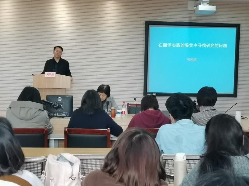 42日下午,扬州大学翻译行为研究中心主任周领顺教授应邀来我院做了一场题为《在翻译实践的鉴赏中寻找研究的问题》的专题学术报告。报告会由杨翠萍副院长主持,温建平院长出席了报告会,部分教师和研究生近40人参加。