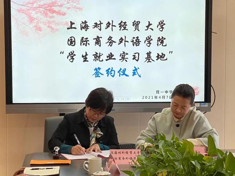 2021年4月7日下午,国际商务外语学院领导一行走访上海市民办茸一中学(以下简称茸一中学),洽谈合作事宜,双方签署“学生就业实习基地”协议并举行挂牌仪式。