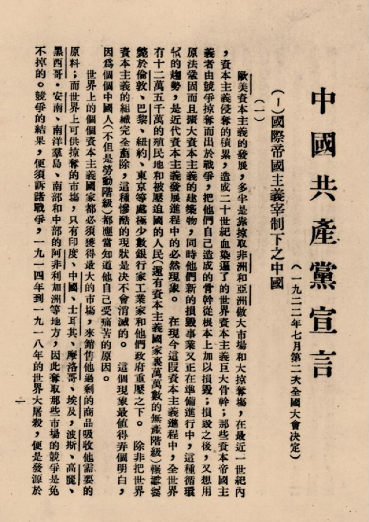 1922年7月,中国共产党第二次全国代表大会在上海召开。大会通过的《中国共产党宣言》是一份具有重大历史意义的文件。