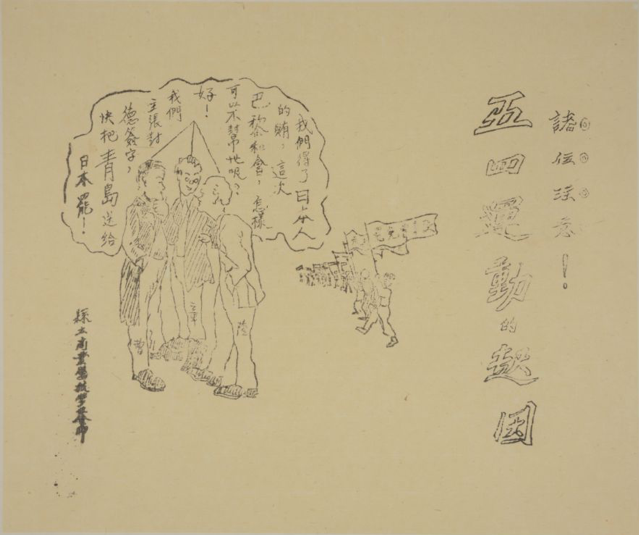 5月4日,震惊中外的五四运动爆发。这是一场以先进青年知识分子为先锋、广大人民群众参加的彻底反帝反封建的伟大爱国革命运动,是中国近现代史上具有划时代意义的重大事件,是中国旧民主主义革命走向新民主主义革命的转折点。在这过程中印刷了大量的传单,形式多样,内容丰富。这是中共一大会址纪念馆馆藏五四漫画传单中的一种。