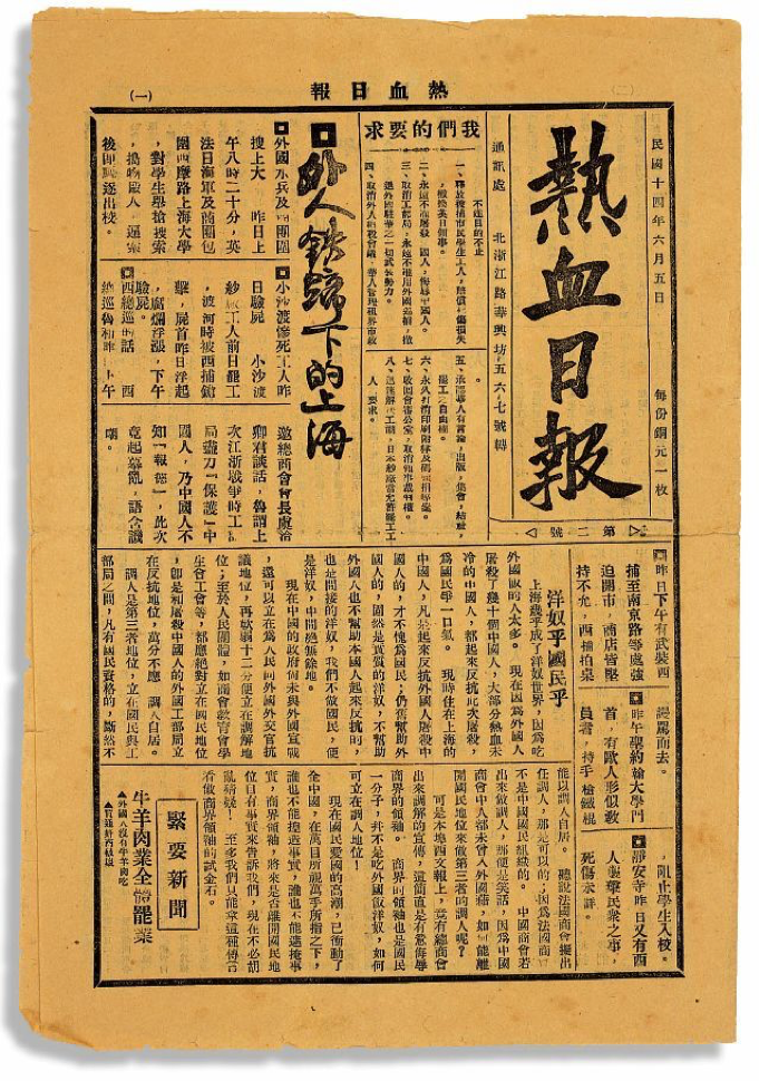 五卅运动中,中国共产党创办了一份如同这个运动一样令人热血沸腾的报纸《热血日报》。它是中国共产党创办的第一份公开出版的日报,由瞿秋白主编,郑超麟、沈泽民、何味辛等人组成编委会,在汹涌澎湃的五卅运动期间共出版了24期,展现出强烈的政治鼓动性和鲜明的革命态度,6月28日被军阀政府强行查封。原件现收藏于中共一大会址纪念馆。