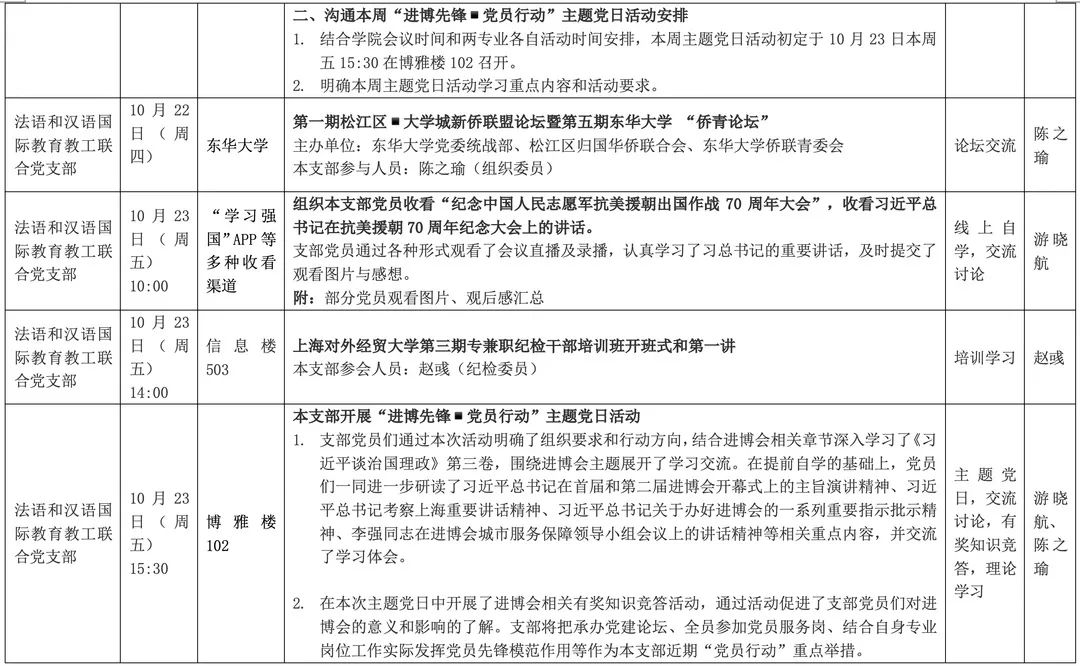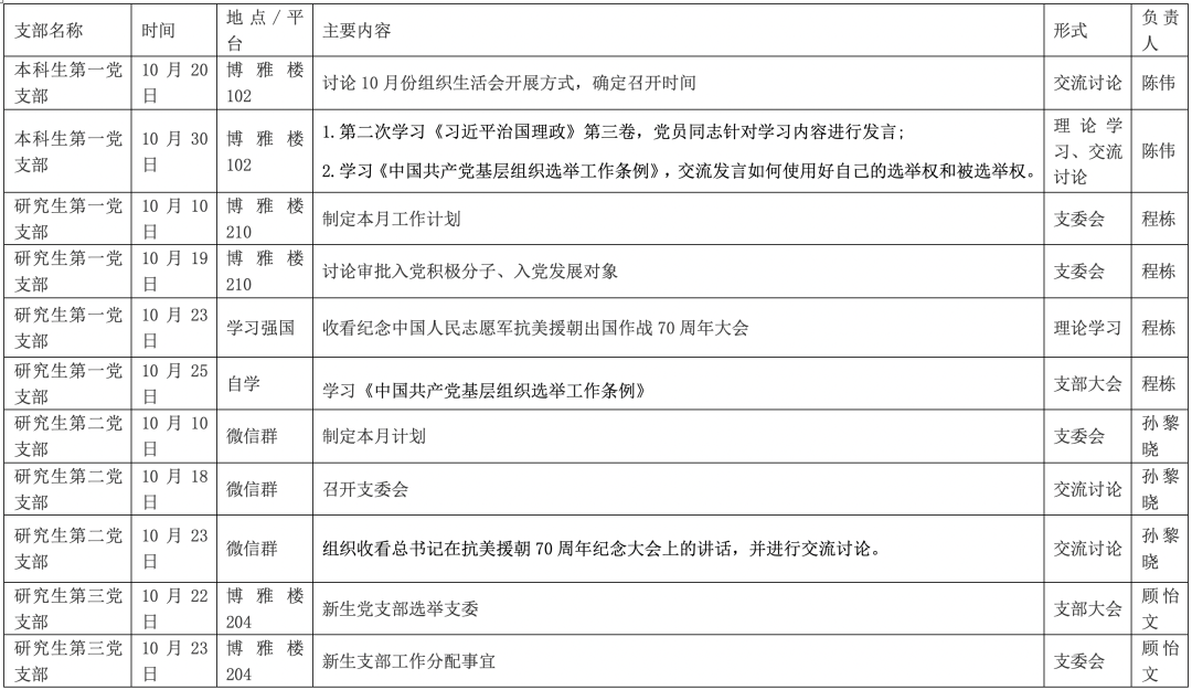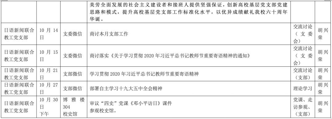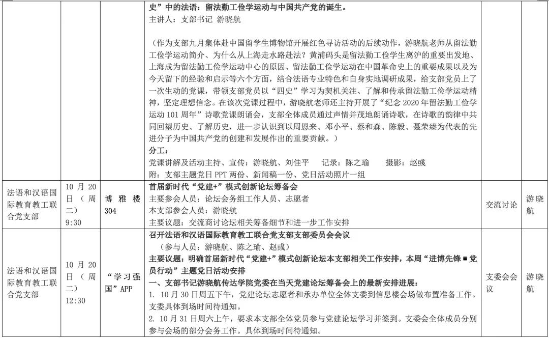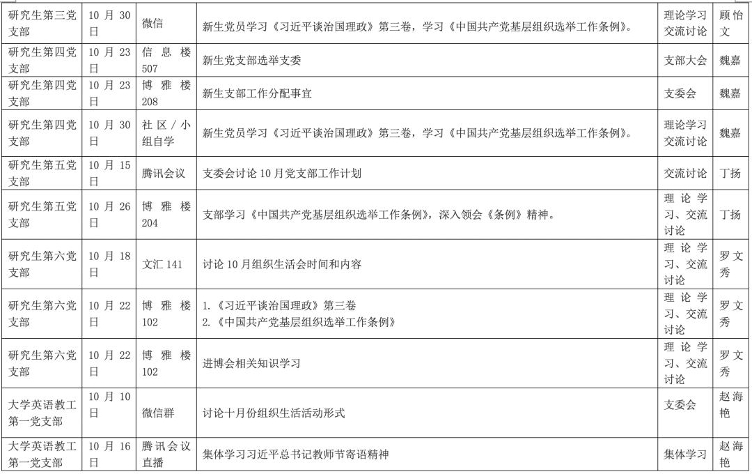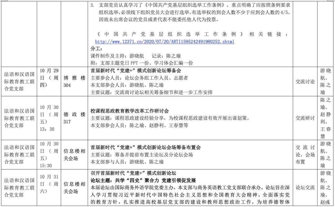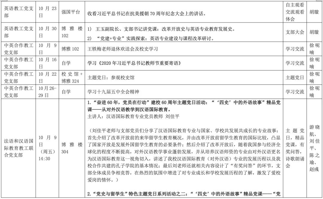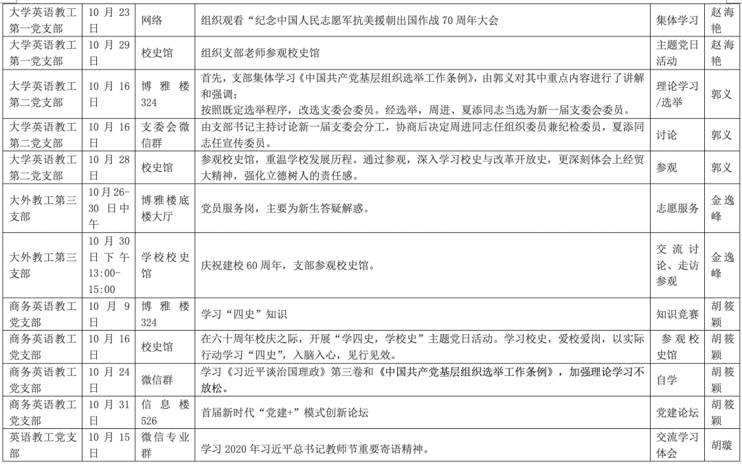 国际商务外语学院党委2020年度支部组织生活月度情况报告表(10月)