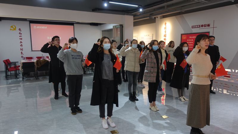 胡筱颖领誓,预备党员庄严宣誓,正式党员重温誓词。面向党旗,党员们举起右手握拳庄严宣誓,用整齐洪亮的语句,向党和人民立下自己的铮铮誓言。