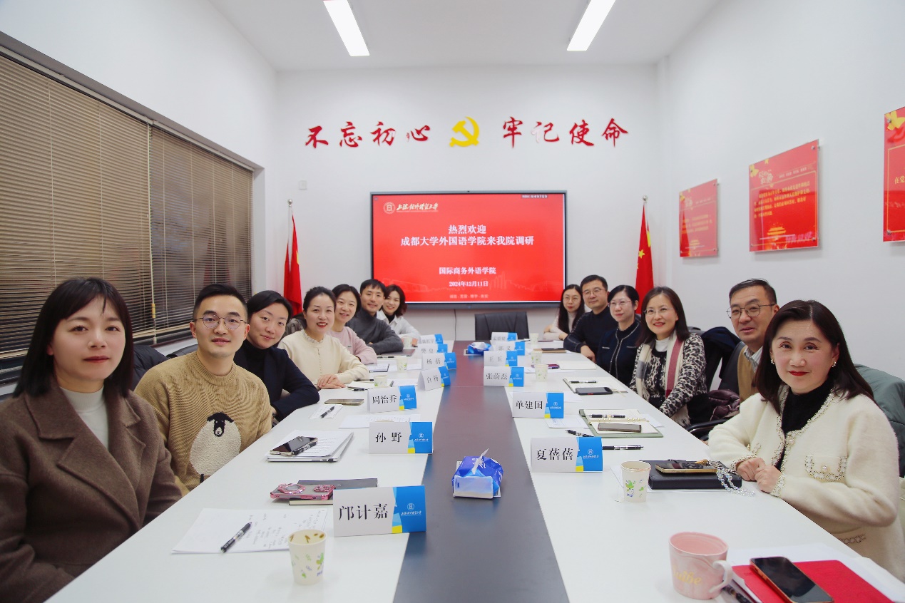 张蔚磊院长首先对成都大学外国语学院一行的到来表示热烈欢迎,并就国际商务外语学院的总体情况以及区域国别学学科建设等情况作了简要介绍。王玉副院长对学院商务英语专业的建设特色与产学研融合的重要举措作了介绍。夏蓓蓓主任补充介绍了商务外语人才培养的具体举措。单建国副院长分享了学院在大学英语教学改革方面的经验,并介绍了学院在推动学校本硕博公共英语一体化课程体系建设所做的努力。郭义副院长围绕学院翻译专硕点建设以及研究生人才培养等情况作了具体介绍。交流会上,白杨院长也介绍了成都大学外国语学院的基本情况专业特色以及校企合作方面的探索。在交流发言环节,双方就共同关心的问题如产教融合、多语种外语人才培养、跨学科师资队伍建设等进行了深入探讨和交流。