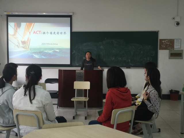 4月24日下午,以“ACT:换个角度看世界”为主题的工作坊在学思楼A101成功举办,由中心的兼职心理老师陈晶晶主持,来自不同学院和年级的8名学生参加此次活动,这也是2017贸大心理文化月系列活动之一。