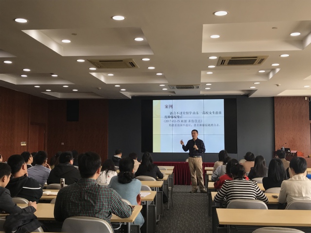 唐教授首先阐述了精神卫生法的出台背景、原因及精神障碍的概念、特征,然后就《精神卫生法》中有关校园心理危机干预的条款进行了详细解读。他结合大量生动实例,深入浅出讲述了根据相应条款,学校、医院、亲属在精神障碍患者诊断、治疗及康复期间需要做的工作及注意事项,同时对心理危机干预工作中的常见问题及处理方法进行专业指导。他提倡教师应当学习和了解相关的精神卫生知识,依法办事,规范大学生心理健康教育及危机干预工作。