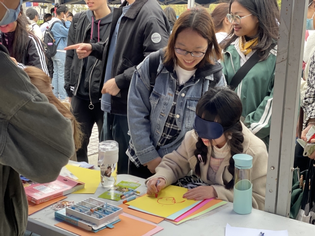 此次游园会由十二个主题活动组成,心有灵犀、开心气球等素质拓展类活动帮助同学们在团体合作中增进信任、挑战自我、放松身心;接词你最行、你放我猜等沟通交流类活动增进了同学们之间的信任与交流,鼓励他们敞开心扉、忘却烦恼,传递彼此浓浓的情谊;盲人作画等艺术表达类活动轻松活泼,引导学生在享受艺术创作的同时增进自我觉察、表达情绪;最吸引学生的是快乐呼啦圈、投掷烦恼、击鼓迎新、筷夹弹珠、挤眉弄眼、快乐传递和幸运大白鲨等体验感悟类活动,学生在参与的同时感受到了心情的愉悦和放松。各主题活动特色鲜明,形式各异,还有各式各样精美的零食供参与者品尝,吸引了大量学生积极参与。