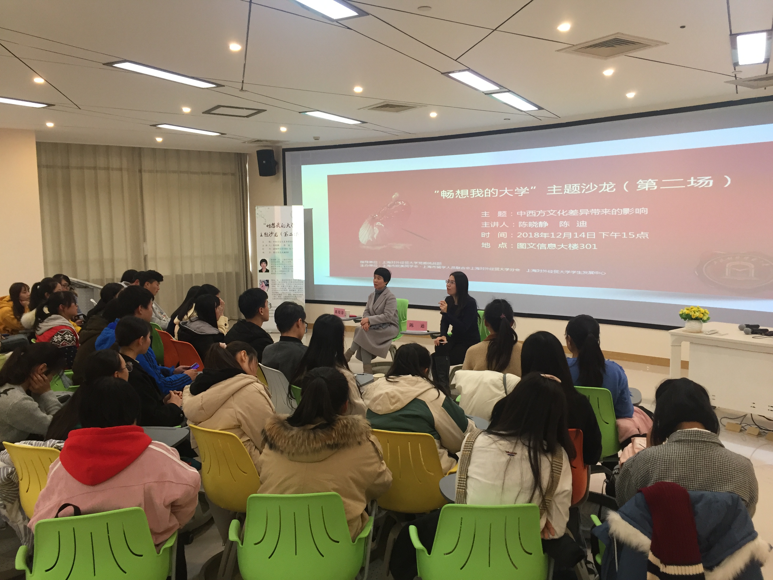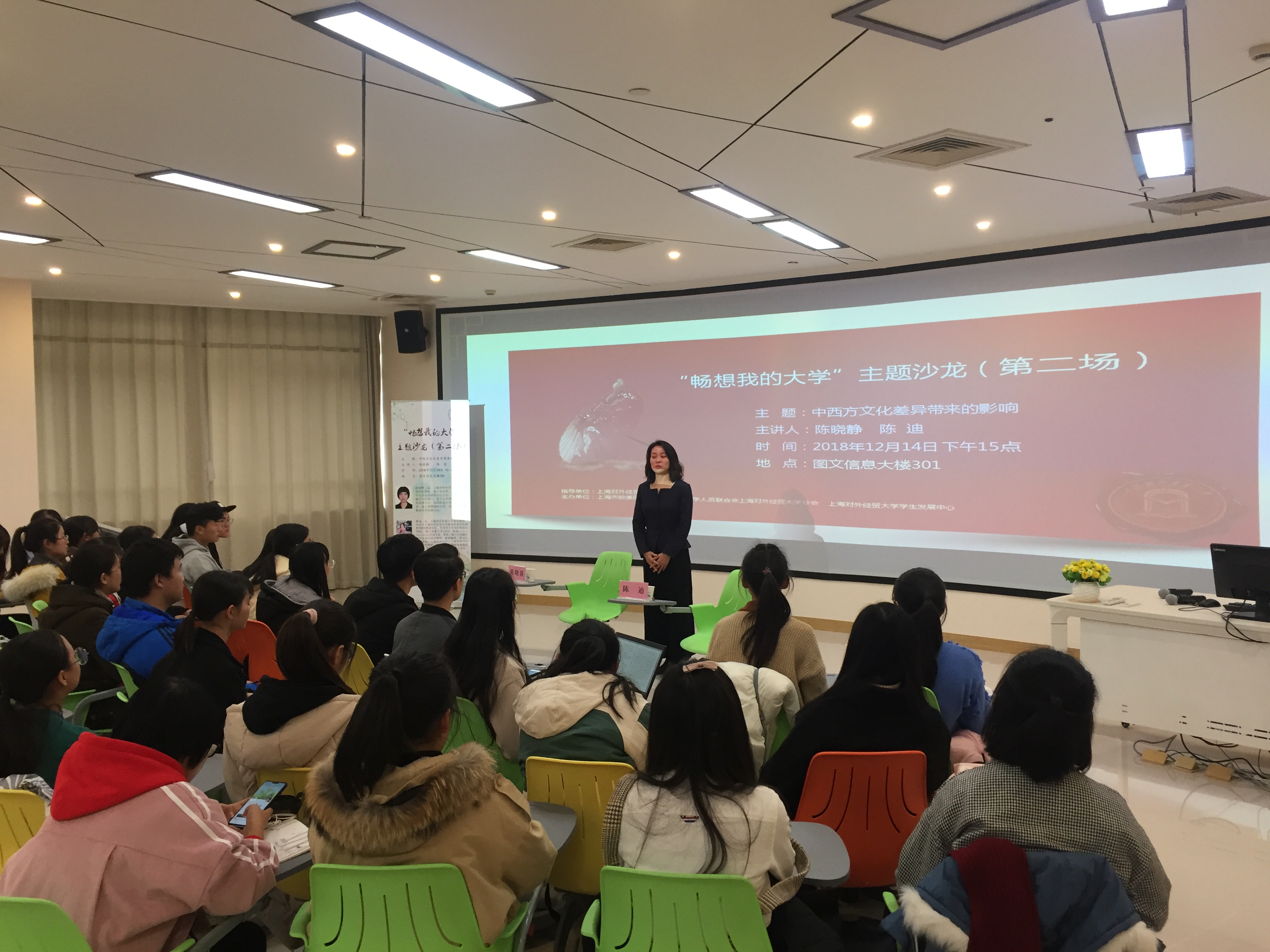 为贯彻落实全国教育大会精神,深入推进必赢626net入口首页全员全过程全方位育人工作,进一步拓展上海市欧美同学会·上海市留学人员联合会必赢626net入口首页分会与学生发展中心合作共建,在校党委统战部与党委学工部共同指导下,12月14日下午在信息楼301研讨室,共建双方举行“畅想我的大学”系列主题沙龙第二场活动,主题为“中西方文化差异带来的影响”。校留联会秘书长阎海燕老师莅临并致辞,校留联会会员、校美国研究中心主任、金融管理学院陈晓静教授和实验教学中心陈迪老师担任本次沙龙主讲嘉宾,新生训练营51名同学参加了活动。沙龙由学工部江昊老师主持。