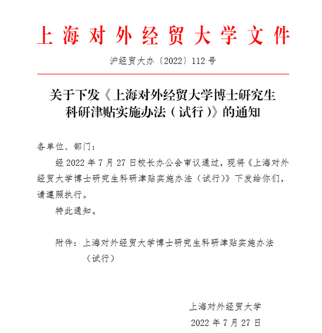 《必赢626net入口首页博士研究生科研津贴实施办法(试行)》(沪经贸大办〔2022〕112号).pdf