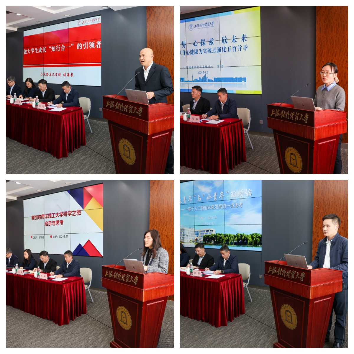 在会议交流发言环节中,马克思主义学院党总支副书记(主持工作)刘海泉、工商管理学院党委副书记张瑞娟、学校心理健康教育中心教师陈倩、统计与信息学院辅导员肖包兴邦分别以《做大学生成长“知行合一”的引领者》《新加坡南洋理工大学研学之旅启示与思考》《新形势 心探索 欣未来》《“大青年”与“小青年”的烦恼——基于人工智能未来发展的一些思考》为题作主题汇报。