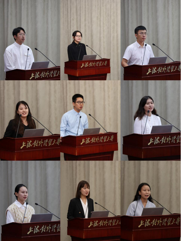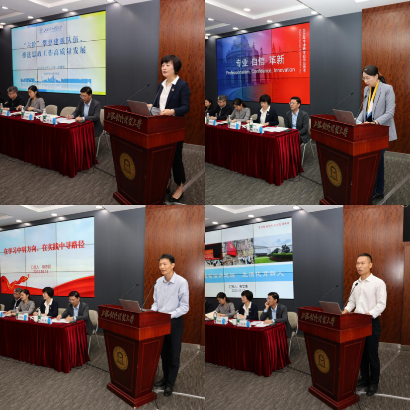 交流发言环节中,党委学工部副部长张晴晴、国际经贸学院党委副书记陈雪、法学院党委副书记兼贸易谈判学院党总支副书记商志民、金融管理学院辅导员关文博分别以《“六阶”攀登建强队伍,推进思政工作高质量发展》《专业·自信·革新——牛津大学研学启示及思考》《在学习中明方向、在实践中寻路径》《用家常话的形式讲道理,用生活化的场景育新人》为题作主题汇报。