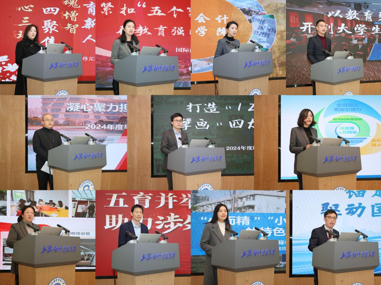 聘任仪式后,举行了2024年度学院学生工作总结考评会。11个学院党委(党总支)副书记分别围绕2024年度学院学生工作举措、具体成效以及下一年度工作思路进行了现场汇报,校领导及相关职能部门负责人担任评委。