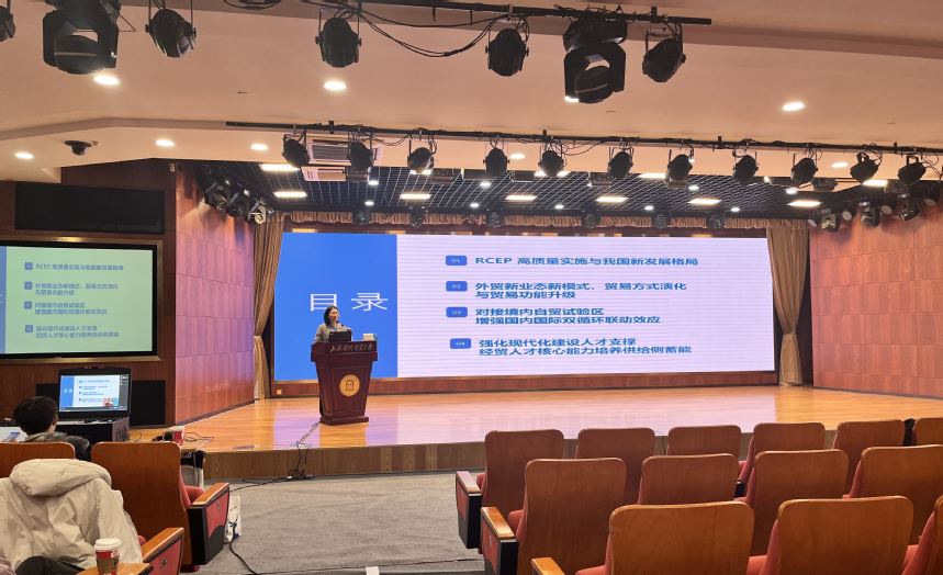 “大思政课”第五讲由国际经贸学院沈克华副教授主讲,主题为《高质量实施RCEP,实施自由贸易区提升战略》,重点围绕“RCEP高质量实施与我国新发展格局”“外贸新业态新模式、贸易方式演化与贸易功能升级”“外贸新业态新模式、贸易方式演化与贸易功能升级”“强化现代化建设人才支撑——经贸人才核心能力培养供给侧蓄能”四个方面进行深入阐释。