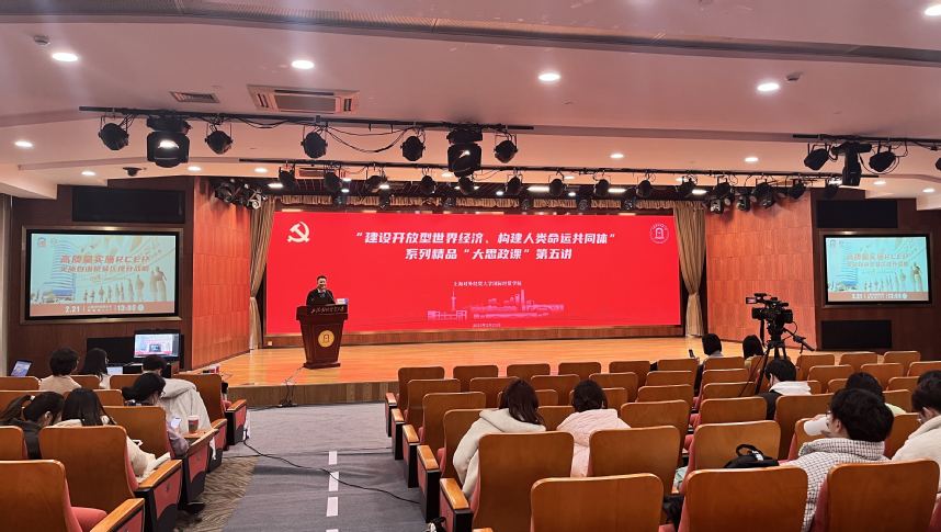 2月21日下午,“建设开放型世界经济、构建人类命运共同体”系列精品“大思政课”第五讲在松江校区信息楼507报告厅举行。国际经贸学院院长何欢浪教授主持,学校官方微信视频号同步线上直播。目前“建设开放型世界经济、构建人类命运共同体”系列精品“大思政课”已获批新设课程,面向本科生开设选修课,本次课程吸引了线上线下的学院师生及校内外4600余名观众共同聆听。