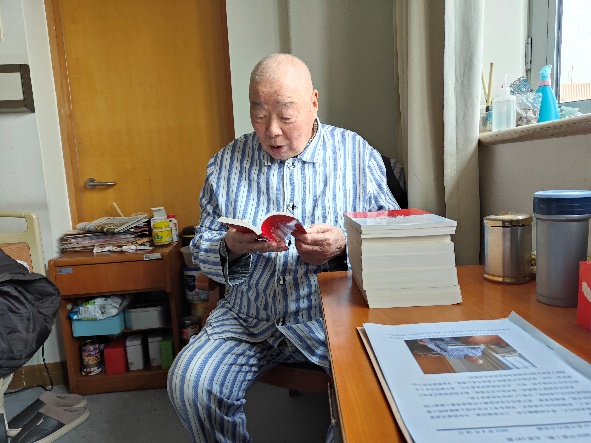 离休支部书记张杰同志一边翻阅学习资料和《简报》,一边说:“学习是一种生活态度、是党员的责任,学校想得真周到,为我送来这么好的书,我足不出户就能进行主题教育学习了。”离休干部姚锋刚出院回到家中,办公室同志亲切询问他的身体和生活状况,了解他的所思、所想、所盼。百岁老人成鼎生的家人还特地发来成老师拿到学习材料认真阅读的小视频,镜头中的成老师神态专注而慈祥。