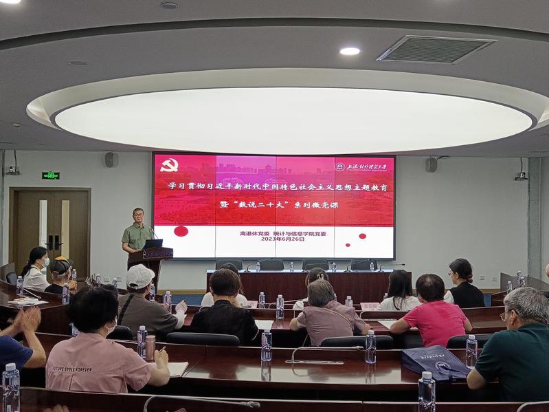 为全面学习贯彻党的二十大精神,着力推进学习贯彻习近平新时代中国特色社会主义思想主题教育走深走实,6月26日下午,离退休党委和统计与信息学院党委联合举办“数说二十大”系列微党课,为退休老党员开展了一场别开生面,令人耳目一新的专场学习会,特别是系列微党课通过大量的数据、图表和对比分析的方式,生动直观、清晰明了,受到了与会老同志的好评。微党课由离退休党委书记董伊金主持,来自统计与信息学院的杨小帆老师、学生党员封冰悦、栗亚茹、徐子炎分专题为老同志们作了讲述。