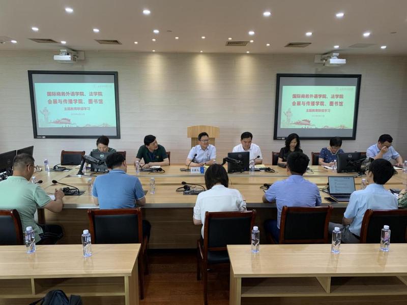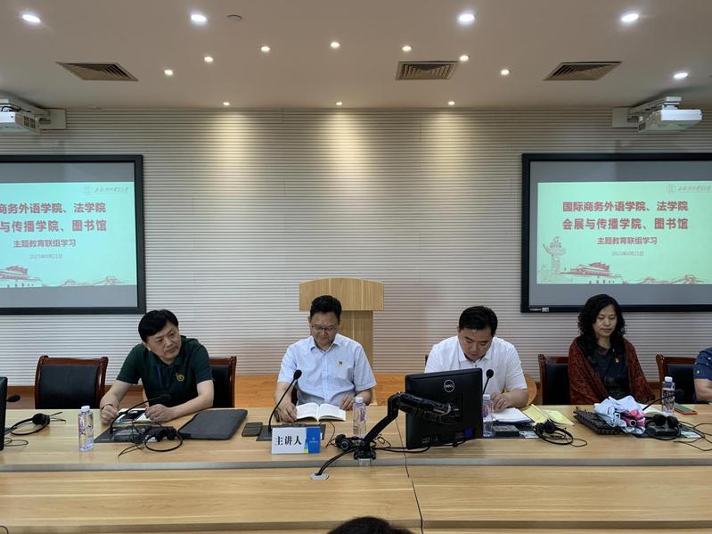 6月21日下午,国际商务外语学院、法学院、会展与传播学院和图书馆开展主题教育联组学习读书班。法学院院长乔宝杰领学了《习近平法治思想学习纲要》,四个学院(部门)的领导班子成员参加学习。读书班由国际商务外语学院党委书记刘根春主持。