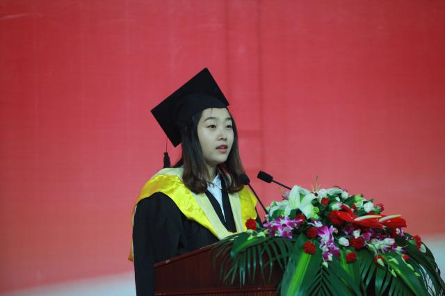 毕业生代表董敏磊在发言中回忆了大学生活的点点滴滴,分享了自己在母校的收获和成长,向教导培养他们的师长、父母表示感谢。她说:“我们从校园中带走的,不仅是一纸文凭,更难忘的是那些珍贵体验。诚信、宽容、博学、务实将是我们每个SUIBER最珍贵的品格,对美的热爱、对知识的探究、对人生的独立思考是我们在母校最大的收获。”