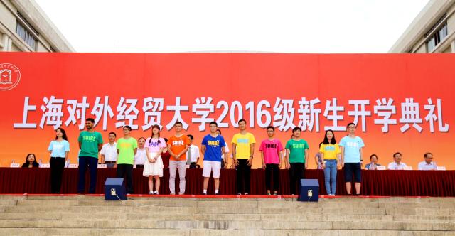 典礼上,与会领导还为新生代表佩戴了校徽及校训徽章,勉励同学们秉承“诚信、宽容、博学、务实”的校训精神,努力成为优秀的新上经贸大人。